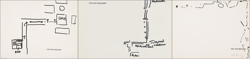 Stanley Brouwn est un artiste très discret, qui pousse l’anonymat jusqu’à ne pas paraître à ses propres expositions. La marche, éloge du mouvement le plus banal, est au centre de son œuvre, au point qu’il avait un jour déclaré que toutes les boutiques de chaussures d’Amsterdam étaient ses galeries. En 1960, il a réalisé une série intitulée This Way Brouwn : dans les rues d’Amsterdam, il demandait son chemin à des passants et leur enjoignait d’esquisser l’itinéraire sur un croquis, où il apposait ensuite son tampon pour l’ériger en œuvre (16). En l’occurrence, l’œuvre est à la fois dans le déplacement lui-même et dans le lien social suscité par ces échanges avec des inconnus. Ces croquis grossiers composent un labyrinthe urbain où l’artiste déploie son activité, et celle-ci est autant physique que mentale.
