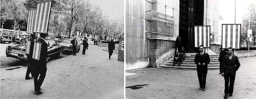 L’artiste est un flâneur qui ne produit rien. Daniel Buren en a fourni une belle illustration avec les Hommes-Sandwichs, quand il s’est promené en 1968 autour du musée d’Art moderne de Paris en portant des affiches dénuées de tout message. Si on ajoute que son rythme doit être lent, c’est un défi supplémentaire. Il faut juste avoir essayé de marcher lentement dans une rue, au sein d’un flot de piétons allant avec vivacité à leurs occupations, pour ressentir à quel point cette attitude dérange. Dans une société où la vitesse et la consommation sont grossièrement privilégiées, cette attitude, gratuite et lente, est à elle seule une provocation.